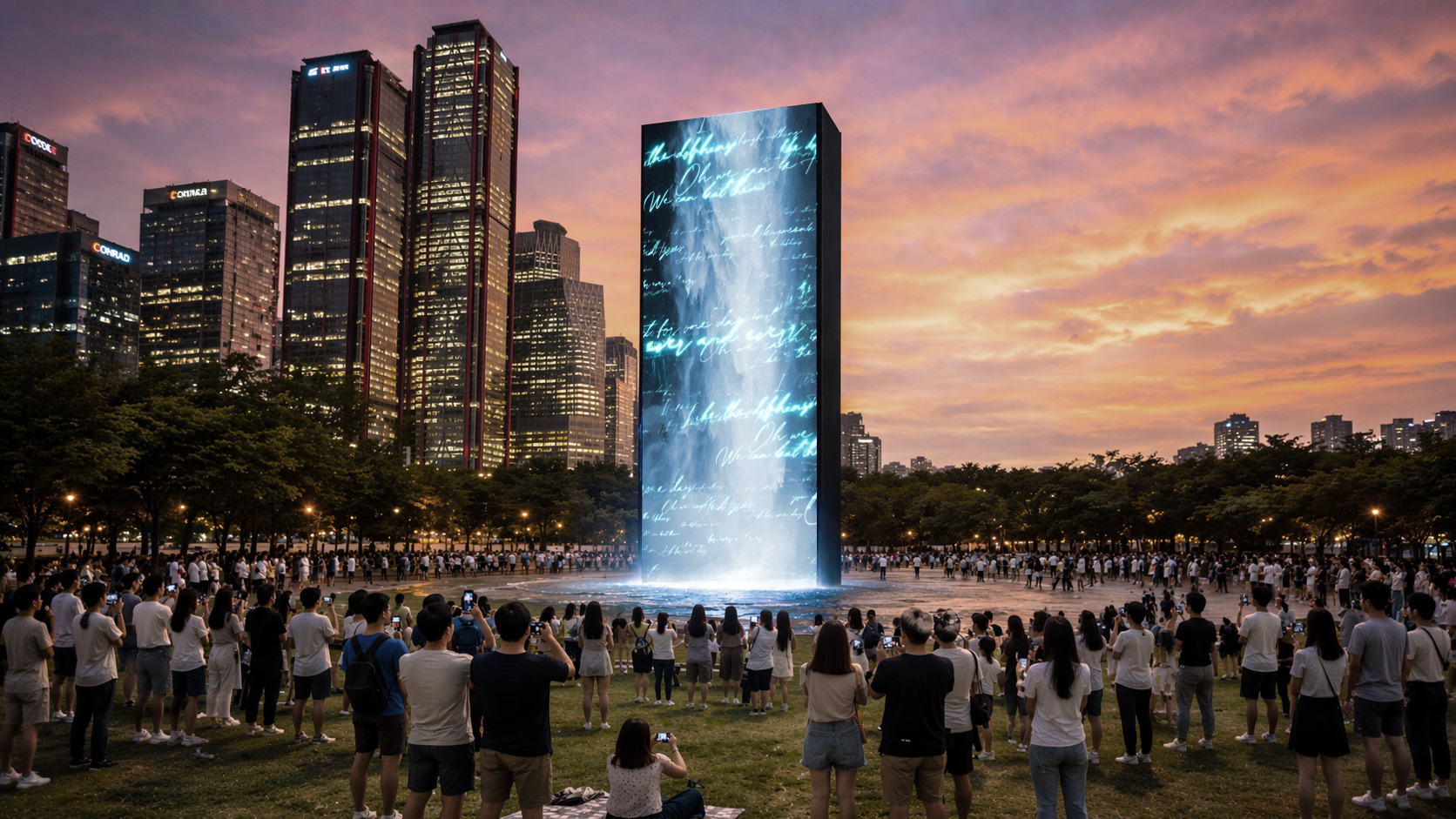 - 도시 자체가 흘러내리는 개념 건물, 빛, 데이터, 사람의 흐름이 폭포처럼 표현 도시의 에너지와 밀도를 시각화